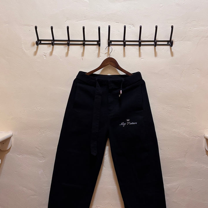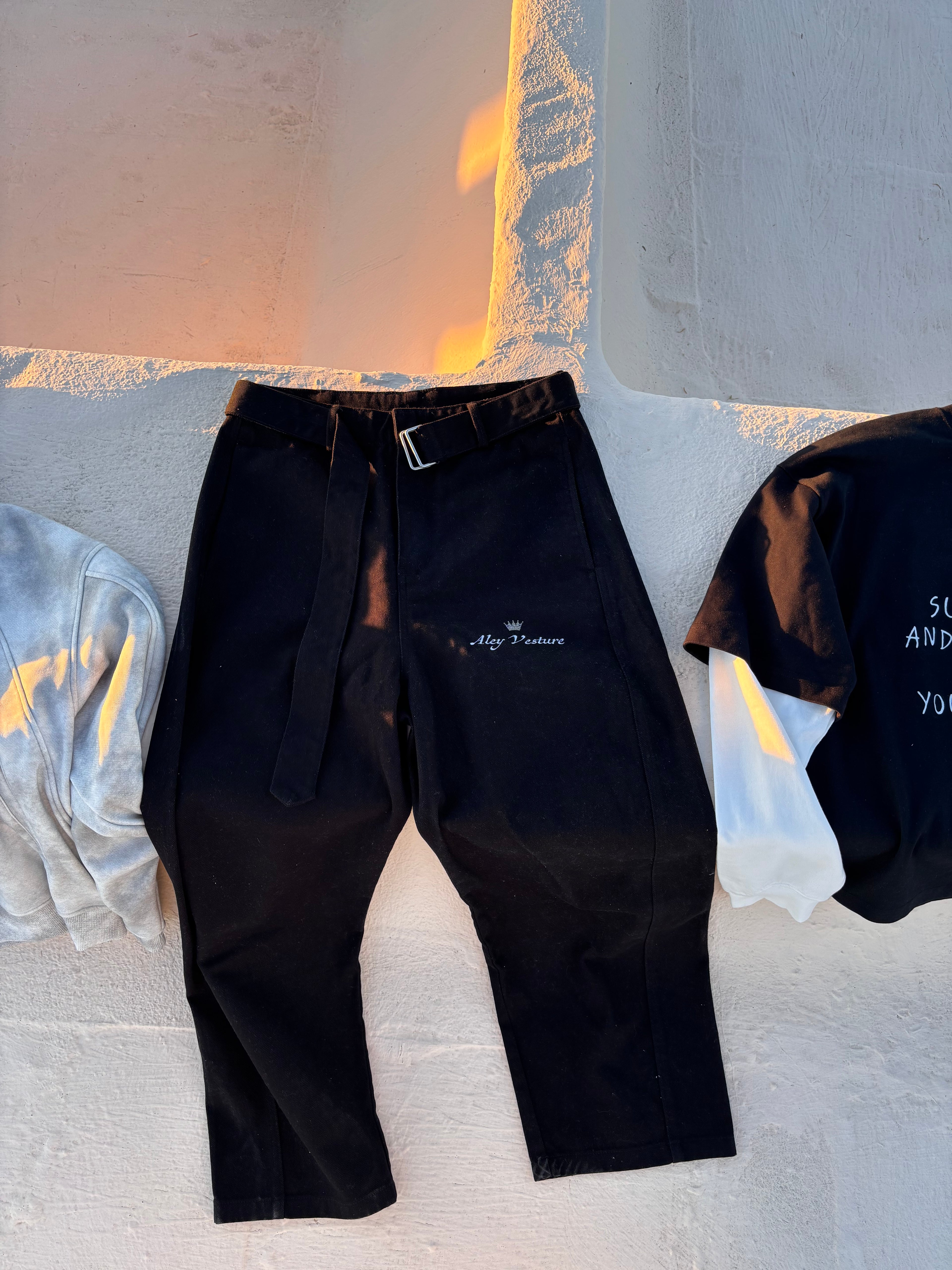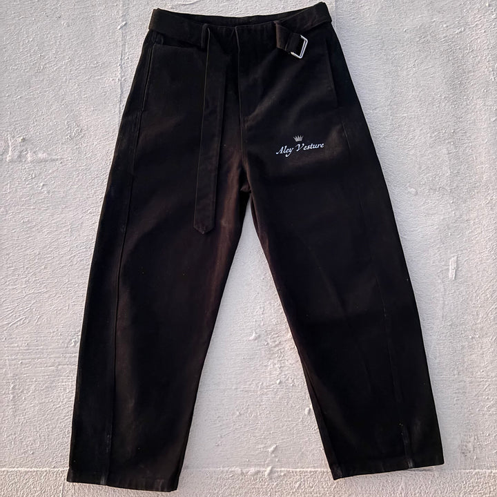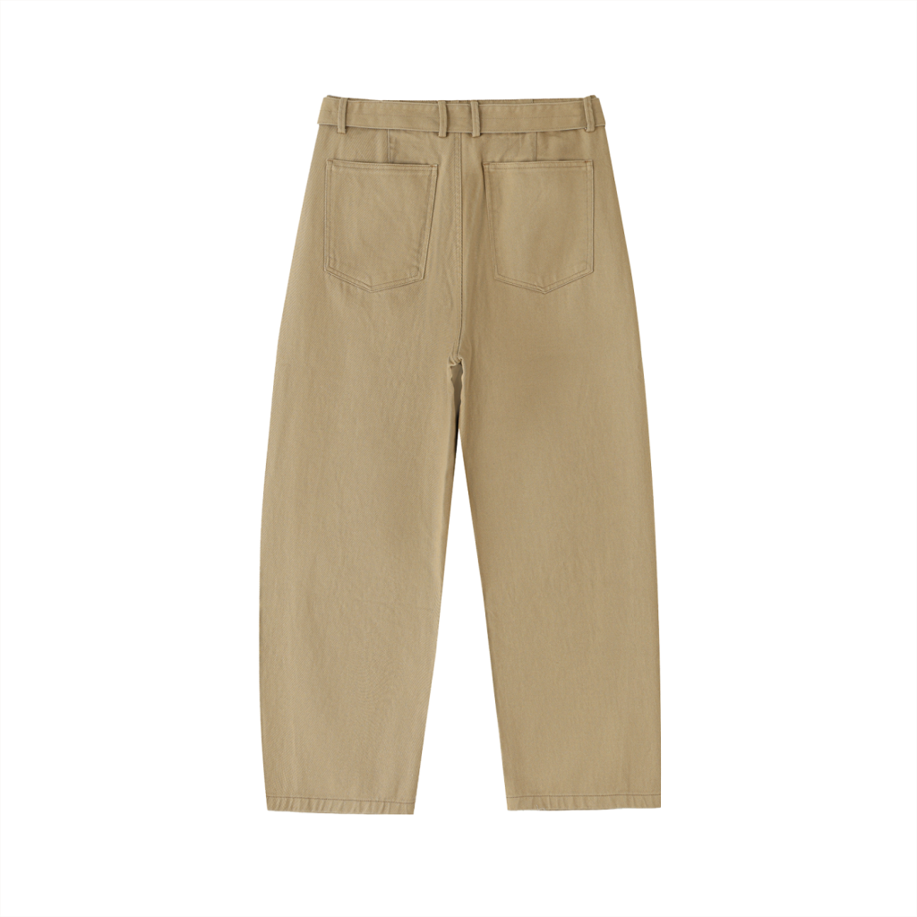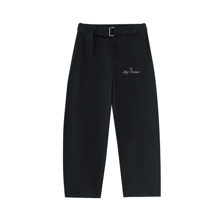 Crafted from 100% cotton, these street-style scimitar-cut pants feature a distinctive curved-leg silhouette with twisted seam details for a modern edge. Available in multiple colors, each pair comes with a matching belt for a coordinated look. Comfortable yet stylish, these pants are perfect for urban streetwear outfits and versatile everyday wear.