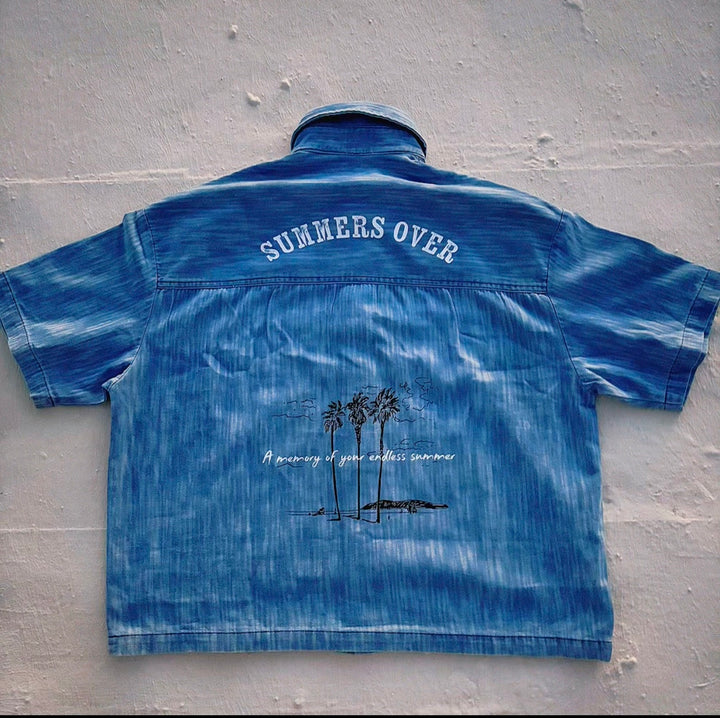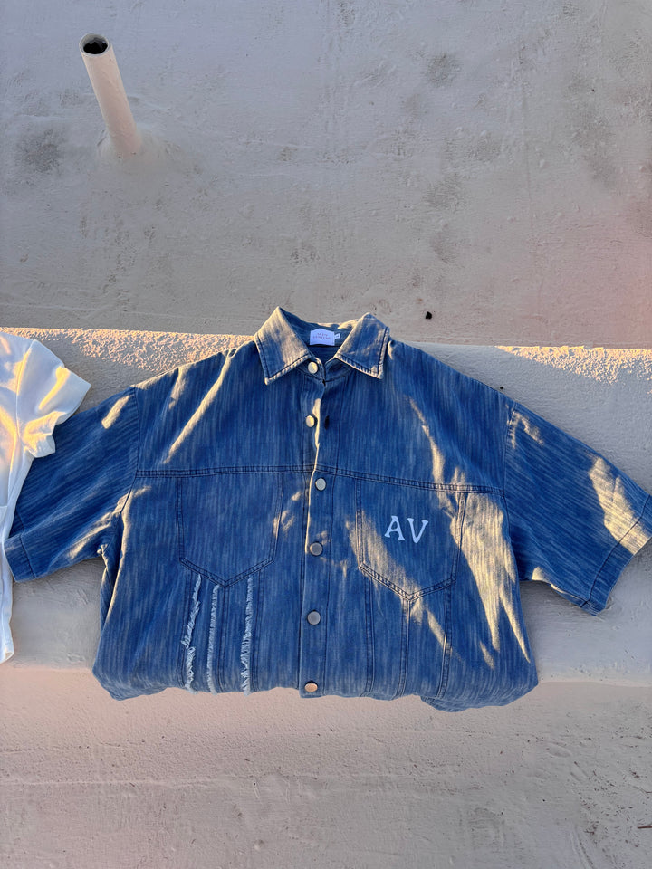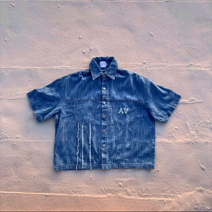 This stylish short sleeve shirt features a faded, washed-out denim look with edgy seam splicing for a trendy, deconstructed vibe. Perfect for casual outings, this shirt blends streetwear edge with soft, breathable fabric—ideal for staying cool and looking cool. A must-have for urban-inspired, loose-fit fashion lovers!